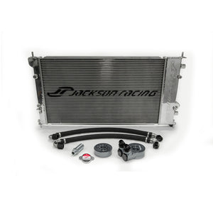 The Jackson Racing Dual Radiator/Oil Cooler was developed in-house in conjunction with manufacturing partner CSF Radiators to be the ultimate solution for FR-S/BRZ Street and Track enthusiasts. With well over a year of development and now multiple national championships, Jackson Racing is proud to bring a true “drop in” all-aluminum radiator with built in oil cooler for the FR-S/BRZ platform. No trimming or cutting needed and installs with all OEM components. The Jackson Racing Dual Radiator/Oil Cooler includes all necessary components for engine oil connections for a true plug and play solution.