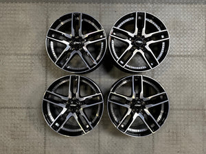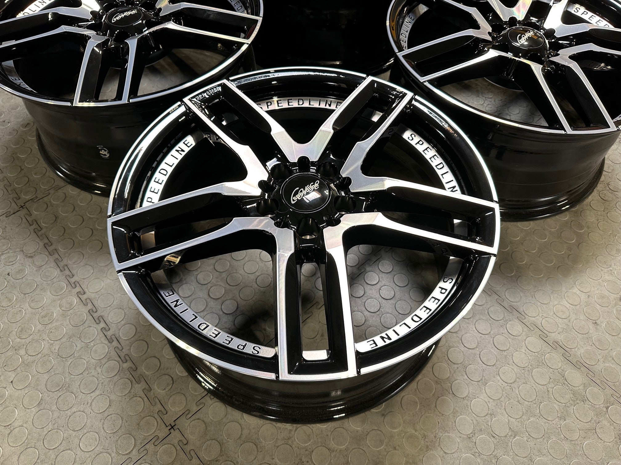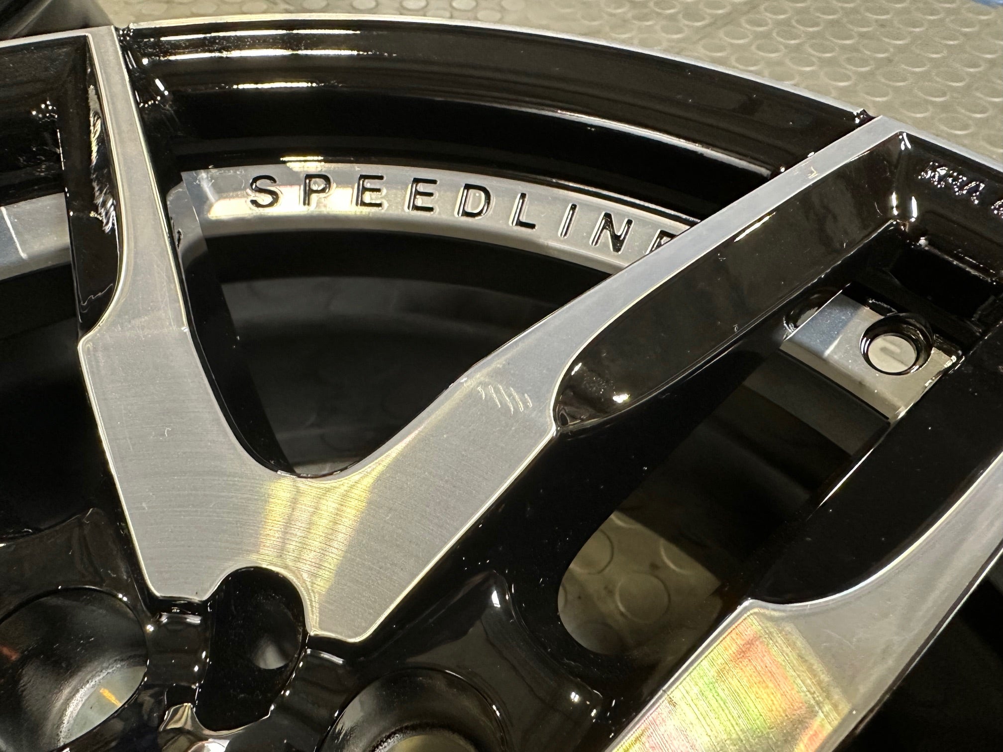 NOTE: One wheel has a small surface blemish from transit and can be seen in the close up image of the wheel. These are brand new and removed from the boxes for picture purposes only. No tires have been mounted or balanced on the wheels.